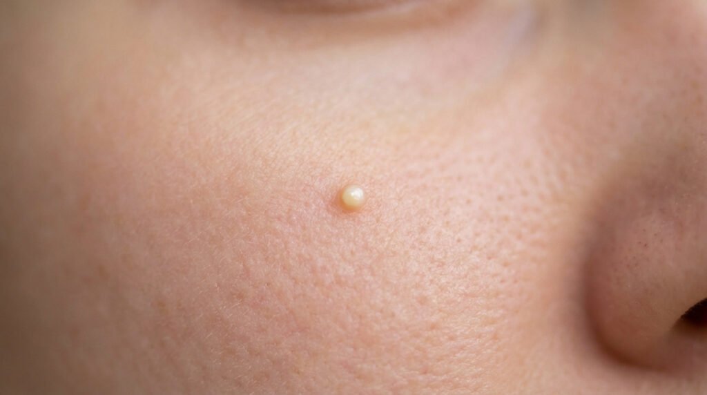 On dirait de minuscules perles coincées juste sous la surface de l’épiderme. Ce sont techniquement des microkystes épidermiques, des petites boules dures au toucher. Leur teinte varie généralement du blanc au jaunâtre selon leur profondeur.